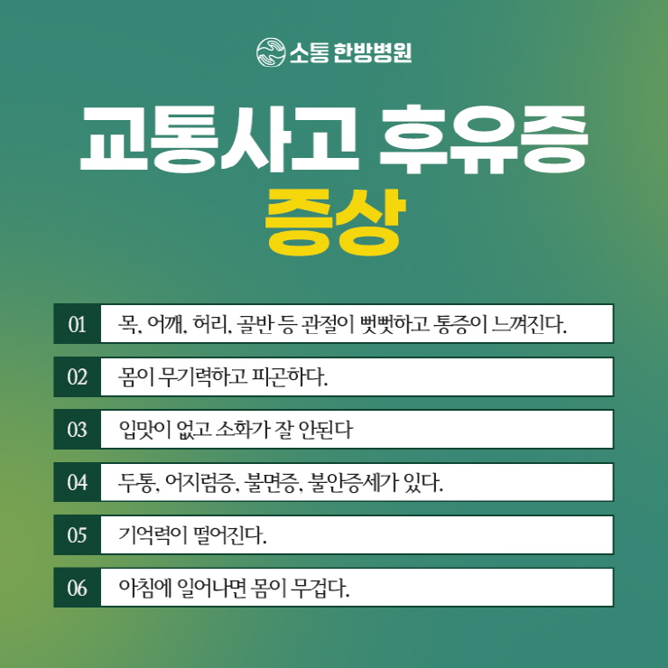 교통사고 후의 후유증은 눈에 보이지 않는 경우들이 많았기에 자칫 간과되기 쉬웠습니다. 그러나 통합 치료 접근 및 세심한 배려 덕분에 많은 환자들이 건강을 회복하면서 일상생활에 무리 없이 돌아갈 수 있었어요.